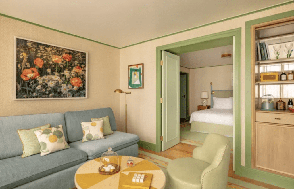 While public spaces exude exuberance, the rooms are studies in cheerful restraint. Floral wallpapers, bright textiles, and mid-century furnishings create an atmosphere of freshness. Many suites open onto terraces with parasols and greenery, connecting the private sphere to the surrounding city and gardens.