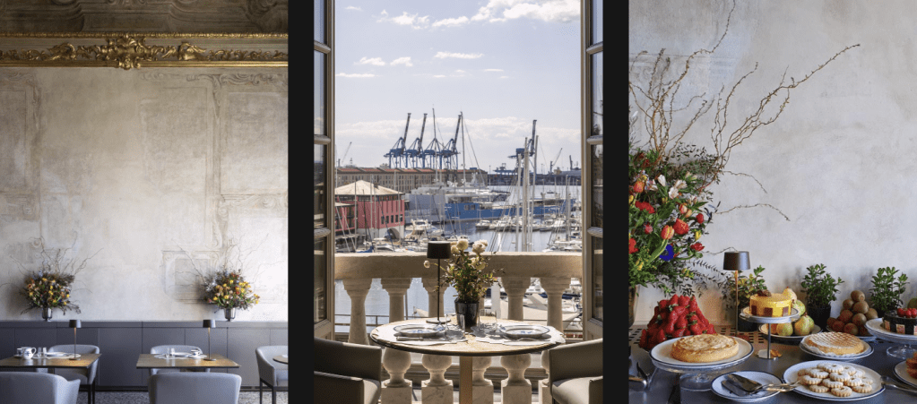 Mornings unfold in the grand salon, where breakfast is served beneath frescoes inspired by Ovid’s Metamorphoses. Guests linger over local delicacies—Genoese focaccia, pesto, artisanal cheeses—while gazing toward the bustling medieval port. Evenings bring aperitivi in the jewel-toned velvet bar, an intimate counterpoint to the palazzo’s theatrical spaces.