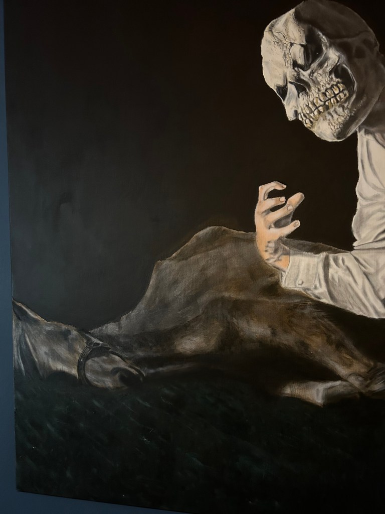 Dandy painting exemplifies Svarre’s evocative style. The dramatic figure—masked, twisting, mid-gesture—stands before a dark backdrop. Light and shadow play across textured surfaces; the composition invites close inspection and rewards reflection. There’s tension here between the human presence and what lies beyond: land, darkness, or perhaps something internal.