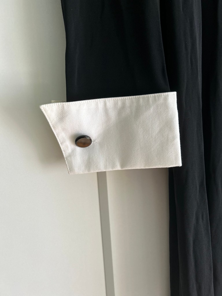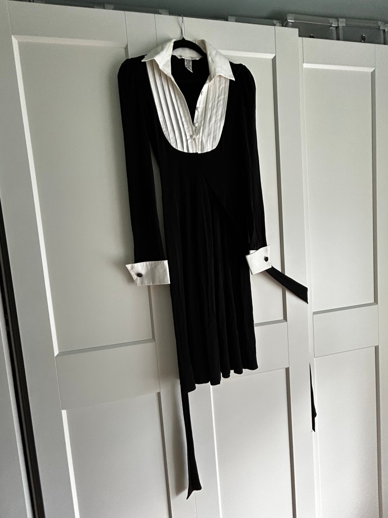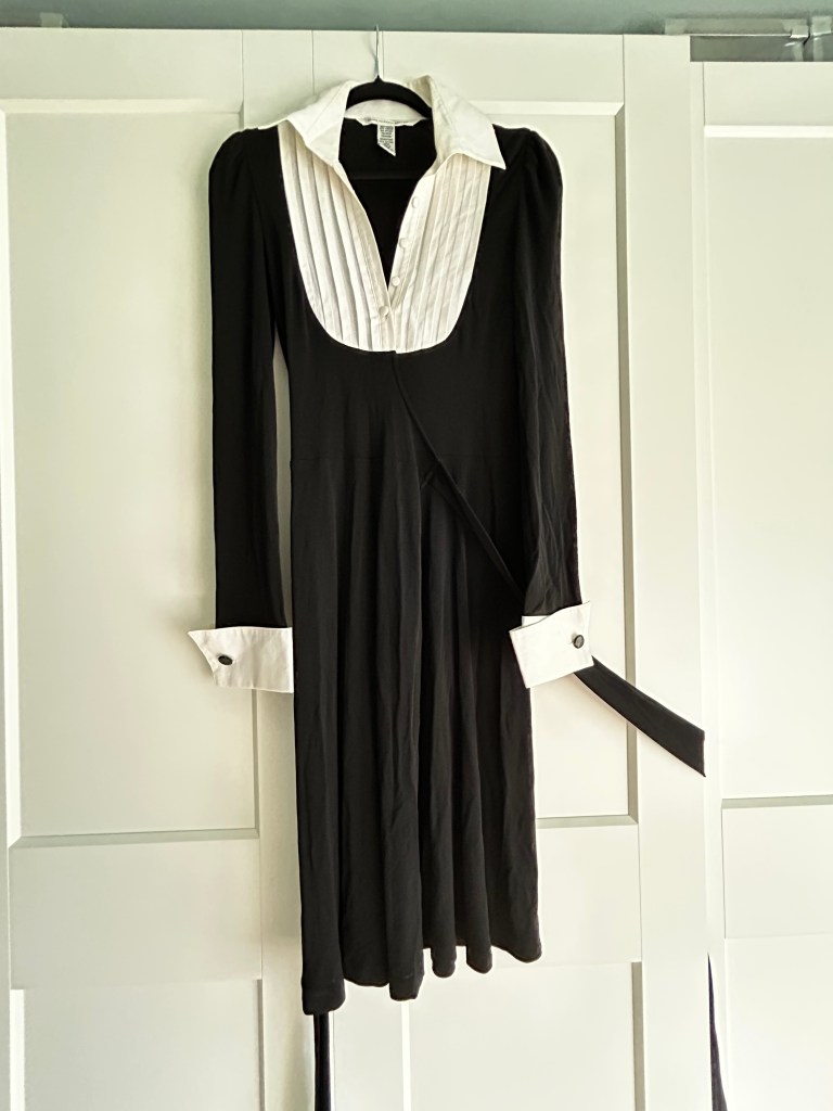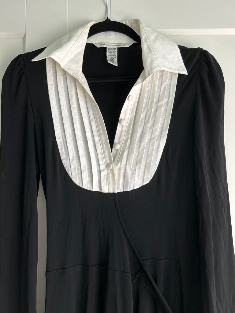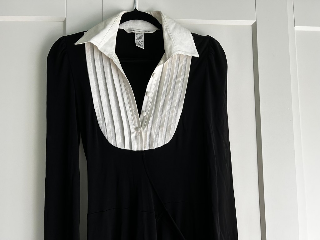 This vintage Diane von Furstenberg wrap dress is a striking example of the designer’s ability to combine timeless elegance with modern edge. The piece reimagines her iconic wrap silhouette with crisp, tuxedo-inspired detailing: a pleated white bib front, sharp collar, and contrasting French cuffs set against the deep black body of the dress.