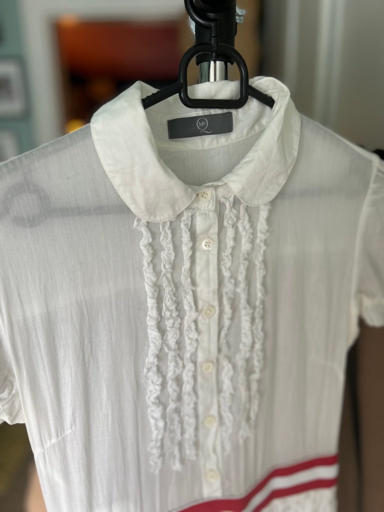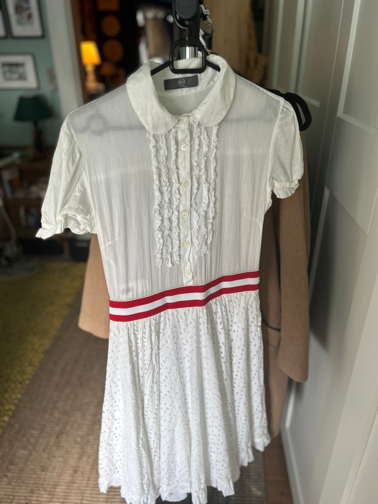 Crafted in lightweight white cotton with delicate textured detailing, it features a Peter Pan collar, button-down front with soft ruffle trim, and a flattering fitted waist accentuated by a bold red double stripe. The skirt falls with gentle volume, giving it a playful yet refined silhouette.