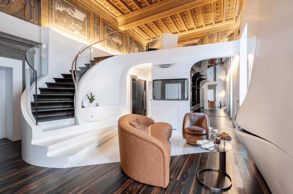 This is Hadid’s genius: not a clash between past and future, but a choreography. The guest moves from ancient thresholds into futuristic halls, from Renaissance walls into spaces where design feels alive, continuous, and cinematic.