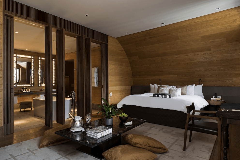 With only 15 rooms, LeCrans is a boutique take on Swiss luxury. Each suite is themed around a mountain range, blending wood, stone, and contemporary art. Its restaurant, LeMontBlanc, has a Michelin star, and the spa offers sweeping views of the Valais Alps.