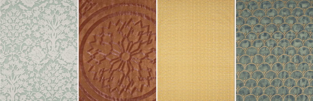 - Printed Velvets – Rich patterns with Renaissance and oriental motifs, layered with metallic pigments for luminosity.