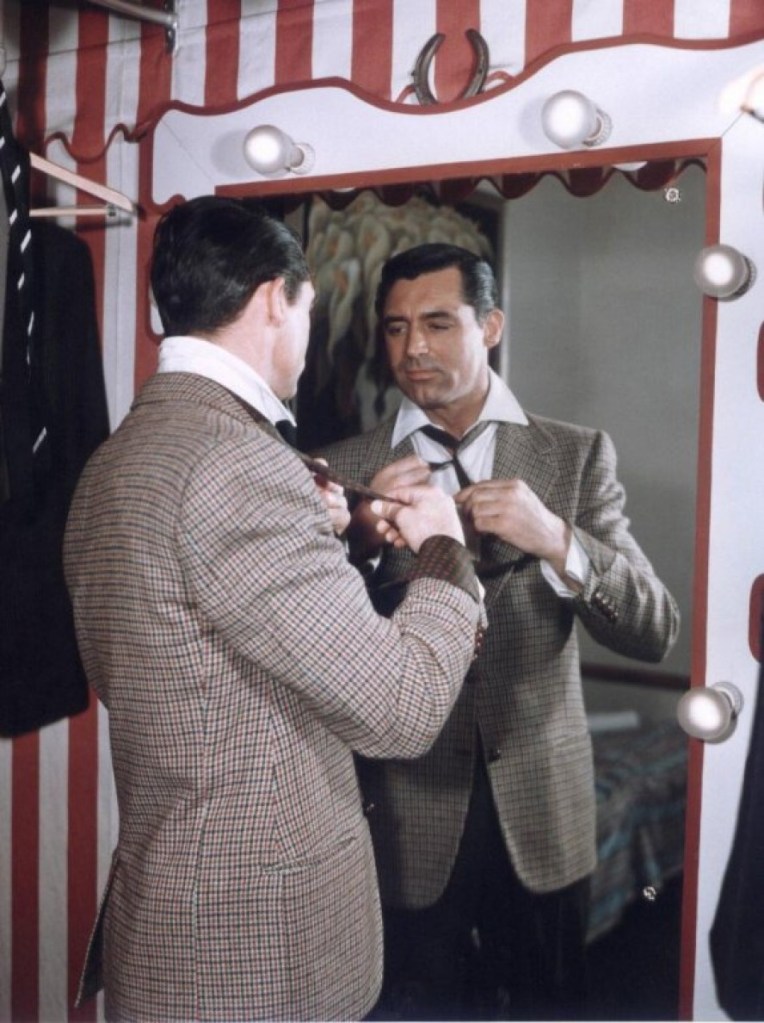 He preferred English tailoring — strong shoulders, clean lines, restrained lapels — but wore it with an ease that was wholly his own. His suits never wore him; he wore them, whether running across Mount Rushmore in North by Northwest or trading witticisms with Katharine Hepburn in Bringing Up Baby.