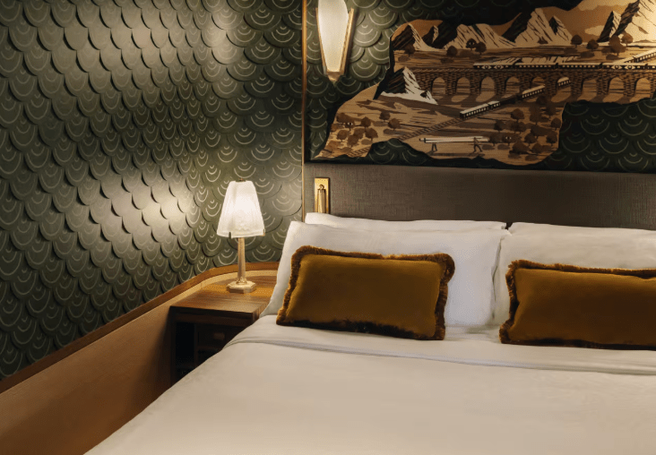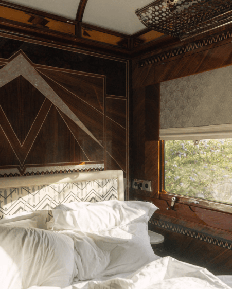 The firm Wimberly Interiors oversaw the creation of the Grand Suites, inspired by the train’s original Art Deco and Belle Époque heritage. Each suite—Paris, Venice, Istanbul, Vienna, Prague, and Budapest—evokes the culture of its namesake city. Rich woods, marquetry, bespoke brocades from Rubelli, and handcrafted furniture create interiors that are sumptuous yet refined. Master artisans like Philippe Allemand contributed inlay work, ensuring the suites retained historic authenticity while offering modern comfort.