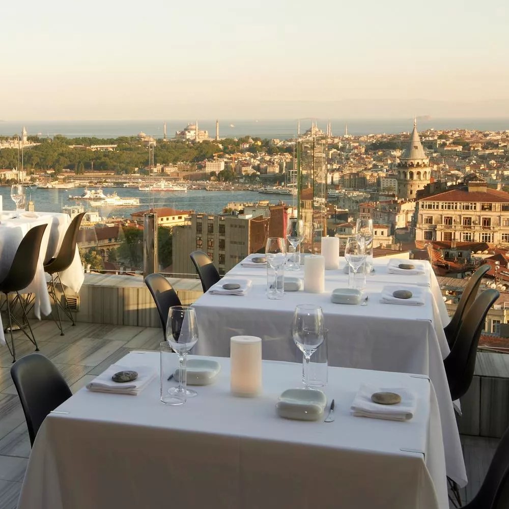 Chef Mehmet Gürs’s rooftop restaurant atop the Marmara Pera Hotel blends Anatolian traditions with Scandinavian precision. Expect Anatolian lamb with foraged herbs, all paired with sweeping views across the Golden Horn.