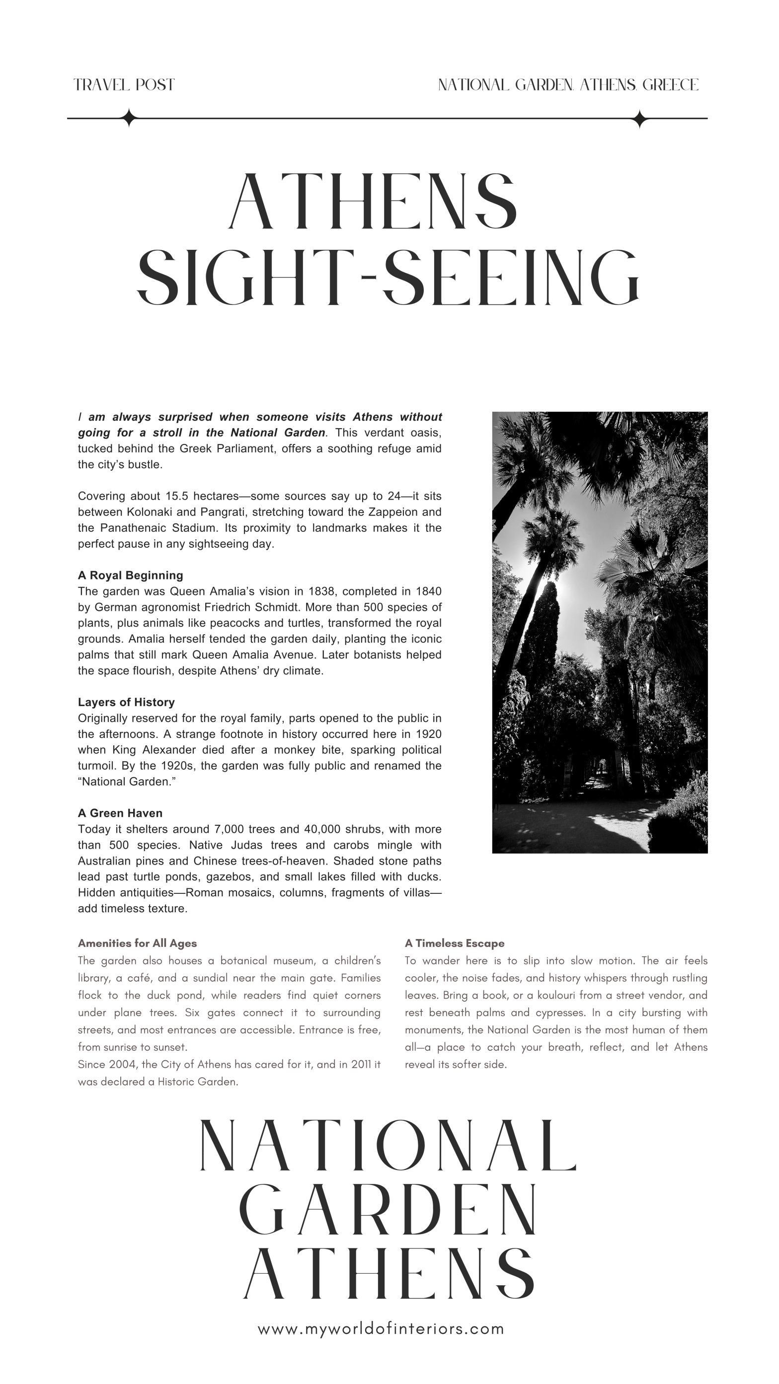I am always surprised when someone visits Athens without going for a stroll in the National Garden. This verdant oasis, tucked behind the Greek Parliament, offers a soothing refuge amid the city’s bustle.